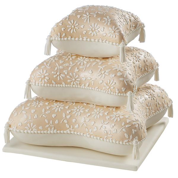 Create a romantic tiered wedding cake in a classic ring pillow shape. Stack the tiers for a dramatic presentation that looks sensational with fondant, especially when textured with Wilton Imprint Mats. Each pan will need to be baked twice, iced and stacked together to achieve the full pillow effect.