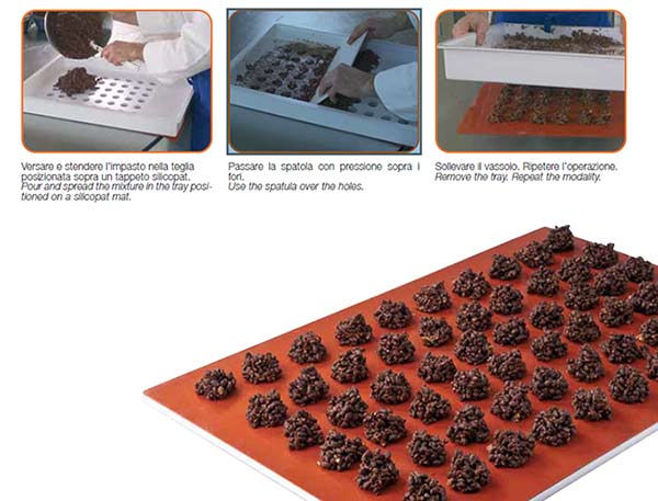 Per ottenere “Grignottines” o “Brutti ma Buoni” con riso soffiato, pezzi di mandorla, nocciola, cioccolato temperato e burro cacao. Composto da: 1 vassoio plastica senza fondo - 2 piatti forati - 1spatola.