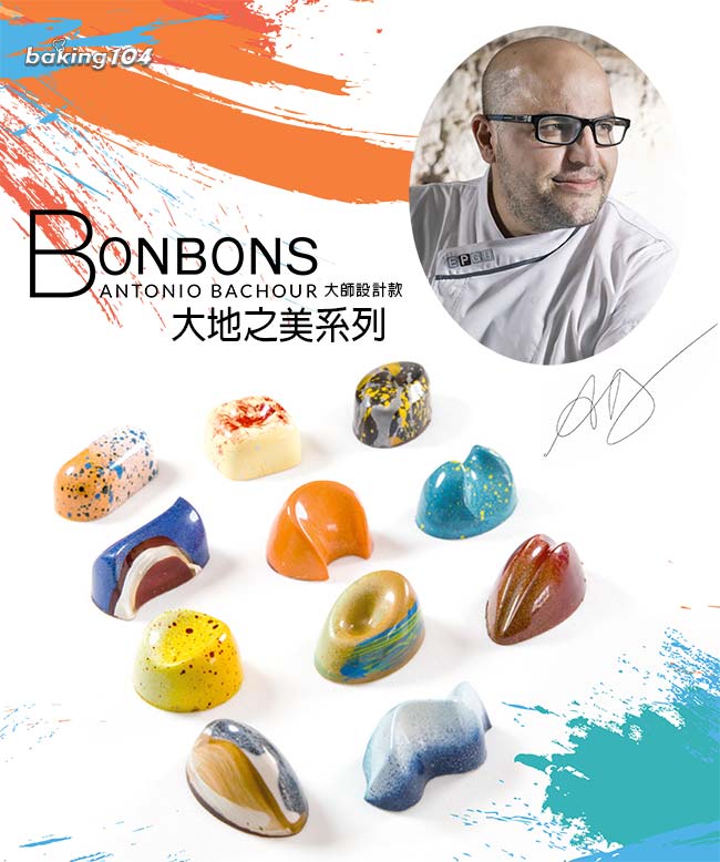 Antonio Bachour大師設計款, 靈感來自山川、岩石、雲朵、河流、窪地、沙丘...等自然造型, 各種迷人的天然景致作為創作線條, 讓每顆巧克力整體呈現效果更有流動感 充滿無限的生命力。