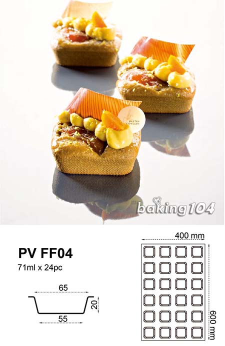 PV FF04 [單槽規格]: 口徑65x65 底徑55x55 高20 mm . Vol. 71ml x 24pc. [模具外徑]:600 x 400 mm [產地]:義大利