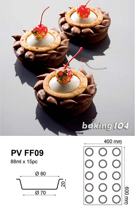 PV FF09 [單槽規格]: 口直徑80 底直徑70 高20 mm . Vol. 88ml x 15pc. [模具外徑]:600 x 400 mm [產地]:義大利