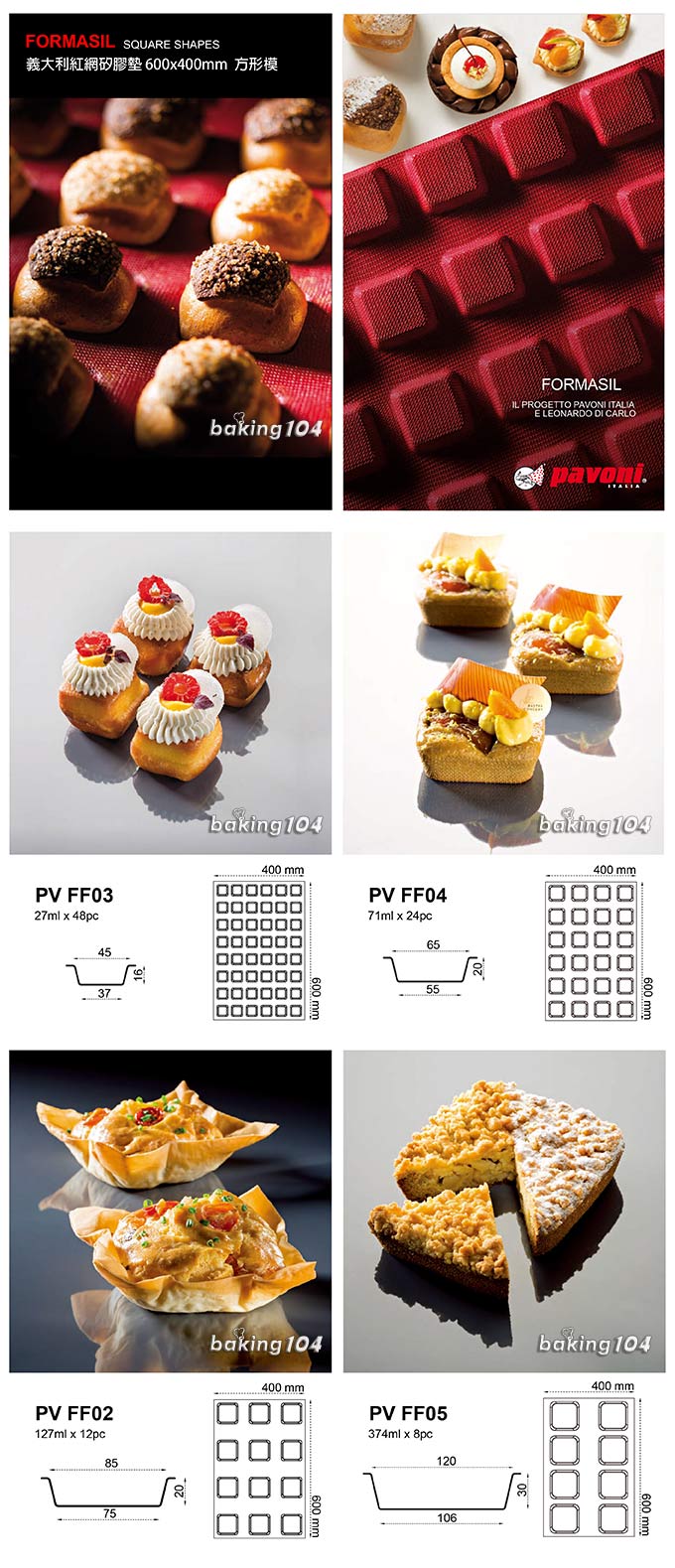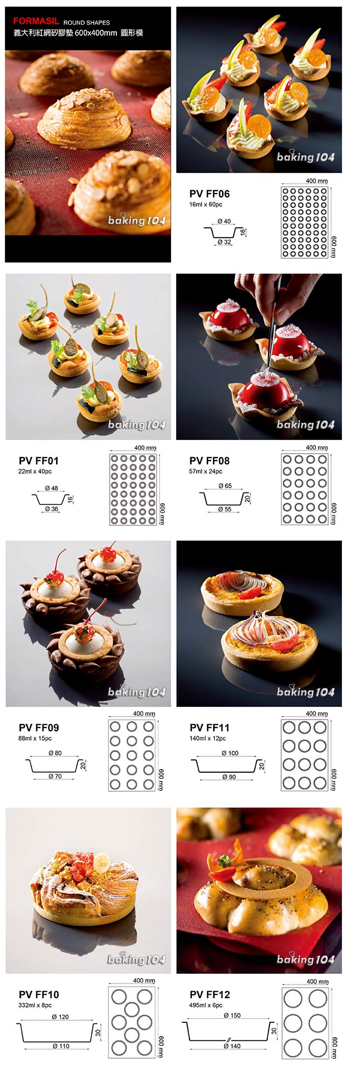 今年相同材質再推新作FORMASIL紅網多連矽膠模 可製作多種不同的點心, 從經典基本款到創新流行,激發更多的想像表現 操作方便,大大提升廚房製作效率, 導熱散熱均勻,使烘烤的派皮塔皮更挺立酥脆 高透氣性,排出多餘的水氣、油脂,減少油脂堆積,更爽口 不沾設計,使用時不須另外抹油, 特別適合用來烤餅皮、塔皮、派皮、泡芙...等點心