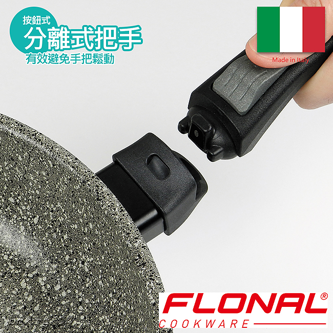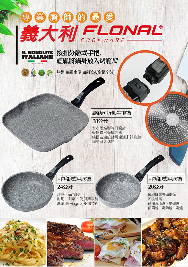 ▲特殊按扣分離式把手 有效避免易鬆動情況, 而且可以整個鍋面入烤箱烘烤, 在烤肉季節時,或BBQ都可當作其中一個烘烤器具, 一物多用。
