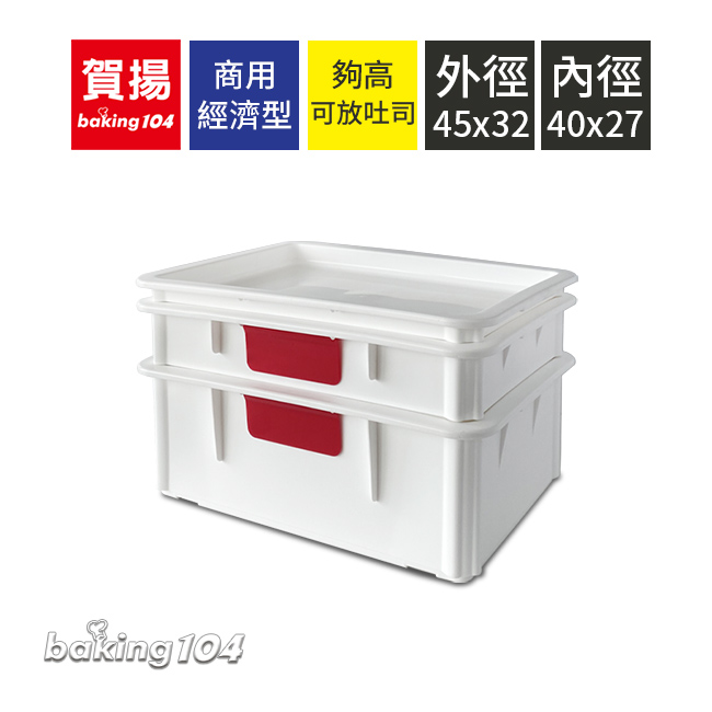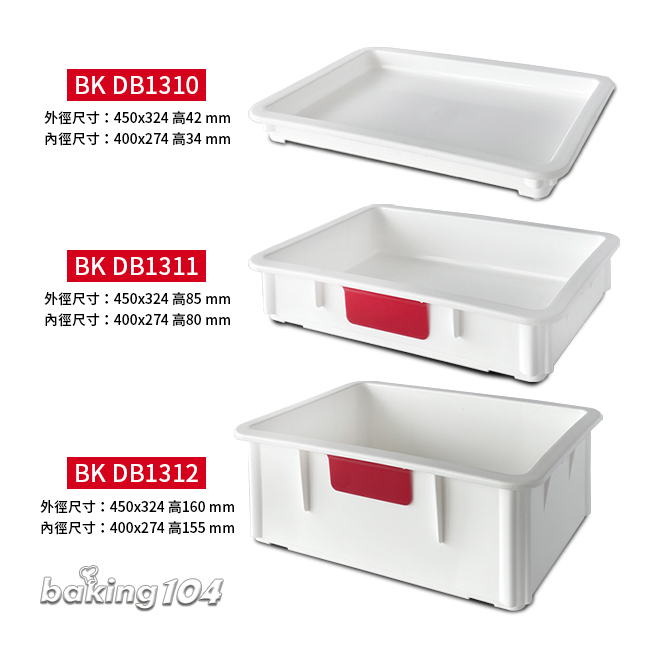 | 型號 | 規格 | 外徑cm | 內徑cm | 白色麵糰箱(小) | BK DB1310 | 蓋/淺型 | 45x32.4,高4.2 | 40x27.4,高3.4 | BK DB1311 | 中型 | 45x32.4,高8.5 | 40x27.4,高8 | BK DB1312 | 深型 | 45x32.4,高16 | 40x27.4,高15.5 |