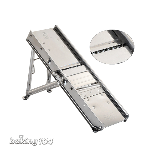 Mandoline inox 38 lames professionnelle sans chariot ◆ 可調整切片厚度 ◆ 切片效果:平滑/波紋 ◆ 全不銹鋼材質 刀片可切出平滑,波紋樣式,厚度可調整3mm和10mm, 穩固的支撐加上四角防滑,高安全性、高效率、高性能。 尺寸:410x135x45mm