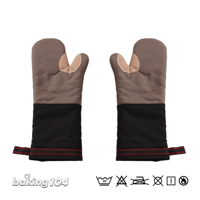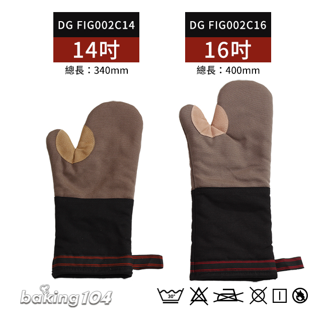OVEN GLOVE · 皮革加強 虎口處厚皮革,提升指間耐熱、減少磨耗 · 厚實棉質 深色耐髒、厚實耐用、包邊細緻不掉線 · 掛繩設計 可吊掛、易收納、易存放 2種尺寸可選: 型號:DG FIG002C14 總長:340mm 型號:DG FIG002C16 總長:400mm 耐熱溫度:250℃ 材質:厚棉棉布+皮革加強