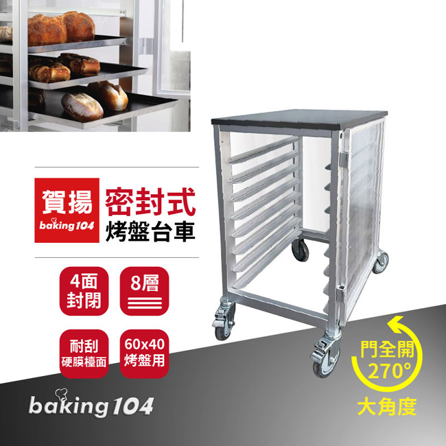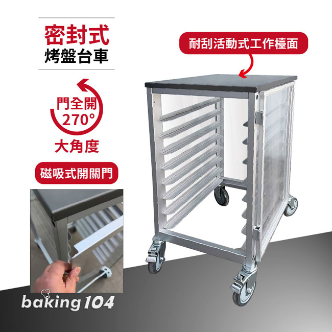 8層固定密封式鋁合金台車 - 可當工作檯,適用烤盤尺寸600x400mm,有門烤盤層車